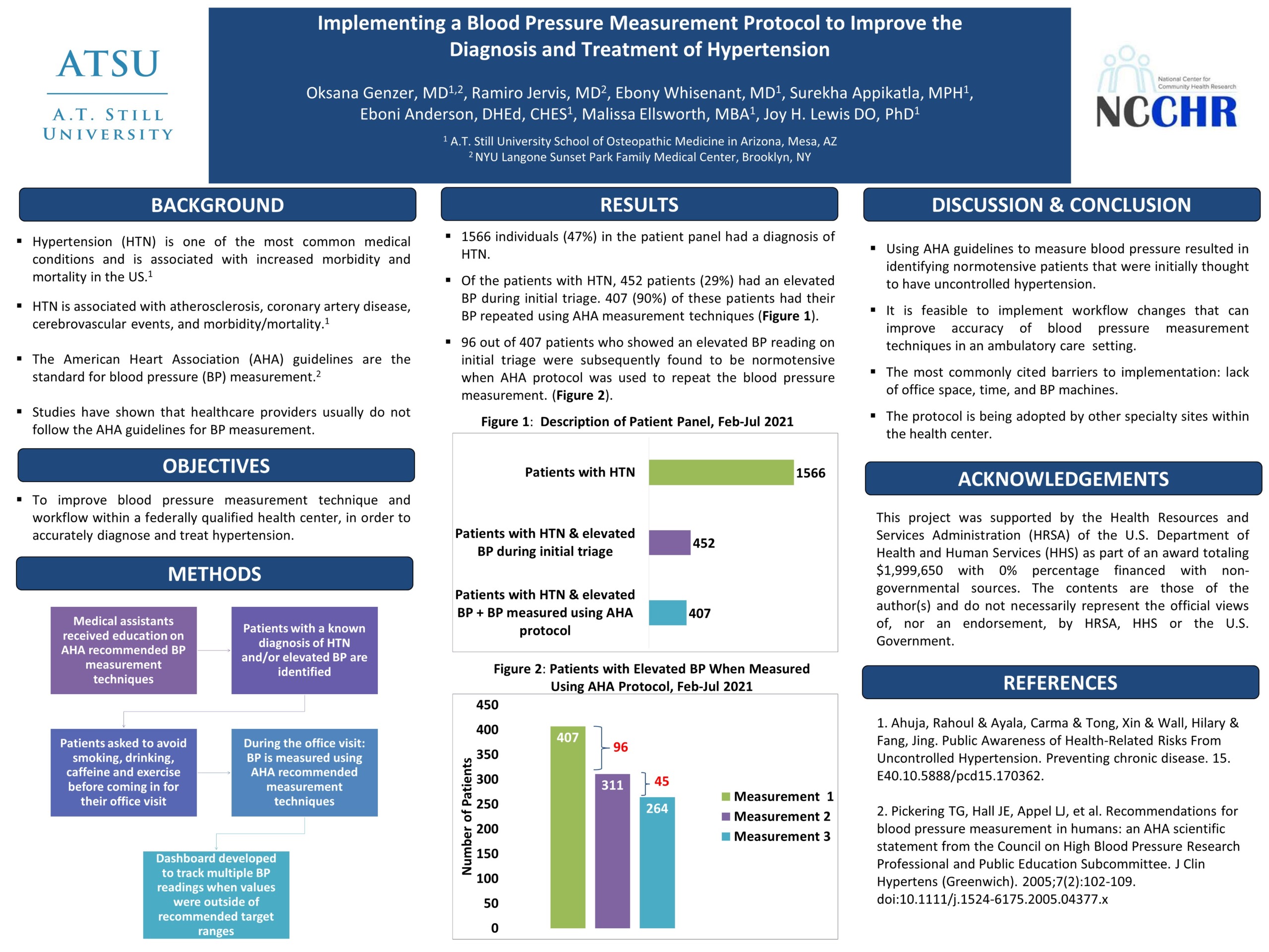 Research Conclusions on Impact on Health Centers: Accurate blood pressure measurement is essential to the diagnosis and treatment of hypertension. Inaccurate blood pressure measurement may lead to failure to identify patients with hypertension resulting in increased risk for cardiovascular disease, kidney disease, stroke, cognitive decline, and mortality. Alternatively, inaccurate blood pressure measurement may also lead to unfavorable outcomes such as adverse medication side effects, increased risk of falls in the elderly, and an increase in hospitalizations. This quality improvement project demonstrates the feasibility of implementing workflow changes that can enhance accurate blood pressure measurement techniques in an ambulatory care setting.