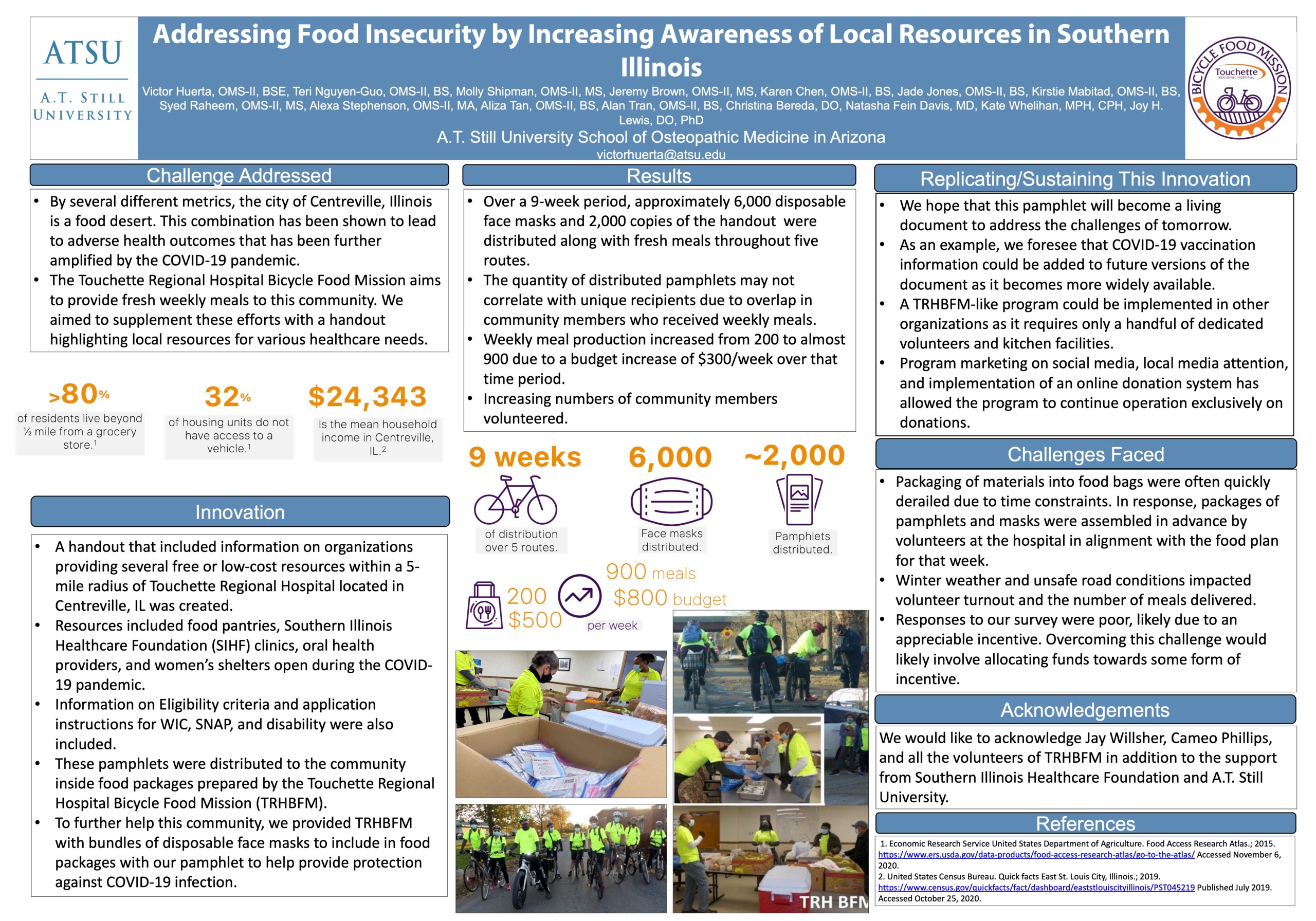 Description of Innovation: We created a pamphlet that included information on organizations providing resources within a 5-mile radius of Touchette Regional Hospital located in Centreville, IL. The pamphlet included contact information and websites for food pantries, Southern Illinois Healthcare Foundation (SIHF) clinics, oral health providers, and women’s shelters. Given the nature of the COVID-19 pandemic, we ensured each organization was open and available prior to including it in the pamphlet. Information on Eligibility criteria and application instructions for WIC, SNAP, and disability were also included. Also, on the pamphlet was a QR code to an optional internet survey asking for feedback on the pamphlet, leaving room for us to improve this resource in the future. These pamphlets were distributed to the community inside free food packages prepared by the Touchette Regional Hospital Bicycle Food Mission (TRHBFM). TRHBFM is a weekly donation-driven initiative that aims to address food insecurity in the area by preparing and distributing hot, nutritious meals to anyone who requests one. To further help this community, we provided TRHBFM with bundles of disposable face masks to include in food packages with our pamphlet to help provide protection against COVID-19 infection.