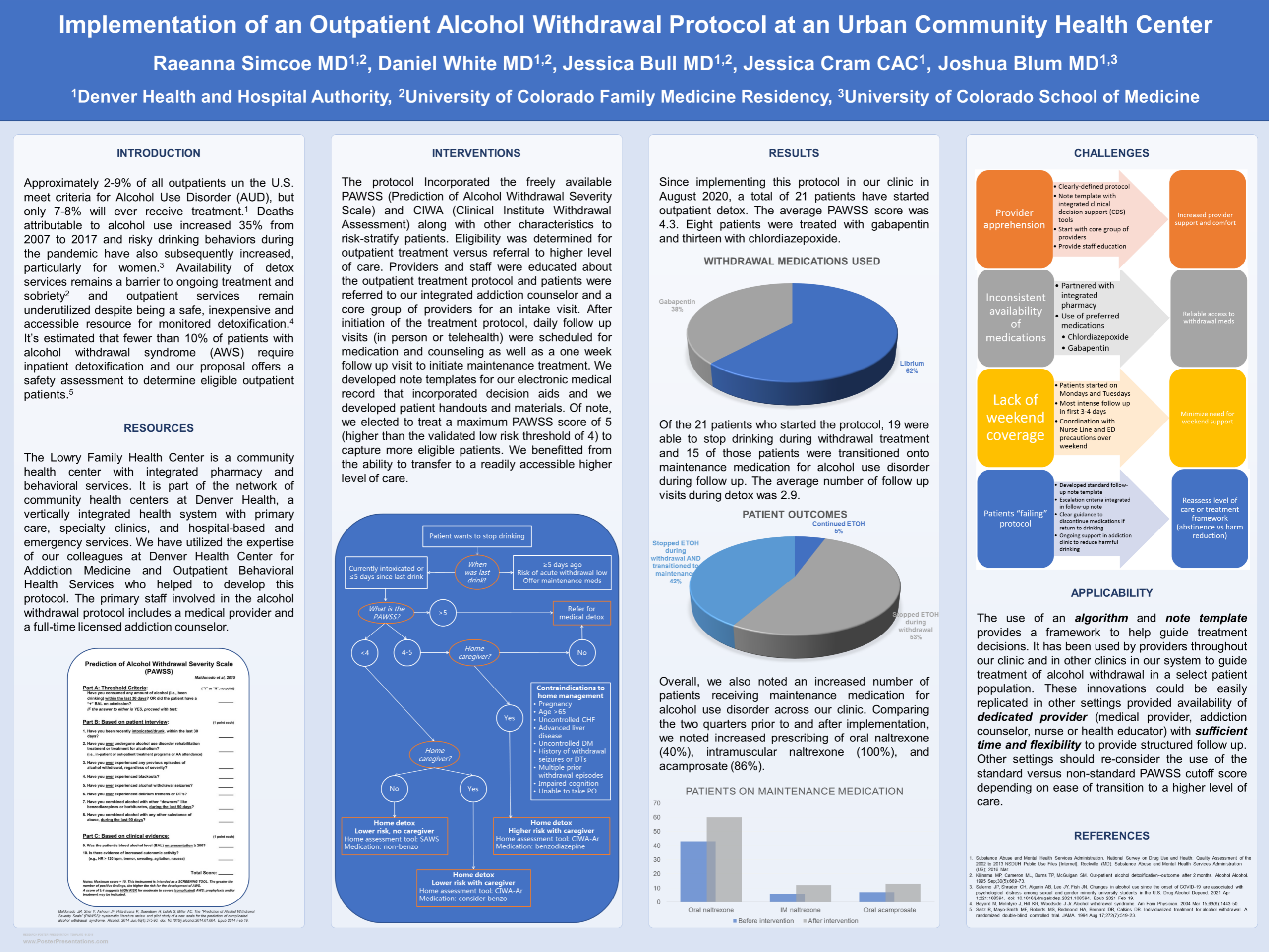 Impact or Result: Since implementing this protocol in our clinic in August of 2020 a total of 19 patients have been referred for assistance with stopping drinking. 15 of these patients were successfully able to stop drinking during the outpatient withdrawal protocol and 14 were transitioned onto maintenance medication for alcohol use disorder during follow up in our addiction clinic.Overall, we have also had a notable increase in patients receiving maintenance medication for alcohol use disorder. In the 2 quarters preceding implementation, our clinic averaged 43 patients receiving oral naltrexone, 6 receiving IM-depo naltrexone, and 7 receiving oral acamprosate. In the 2 quarters since implementation, our clinic averaged 60 patients receiving oral naltrexone, 12 receiving IM-depo naltrexone and 13 receiving acamprosate representing a 40%, 100% and 86% increase in prescriptions for maintenance medications treating alcohol use disorder.