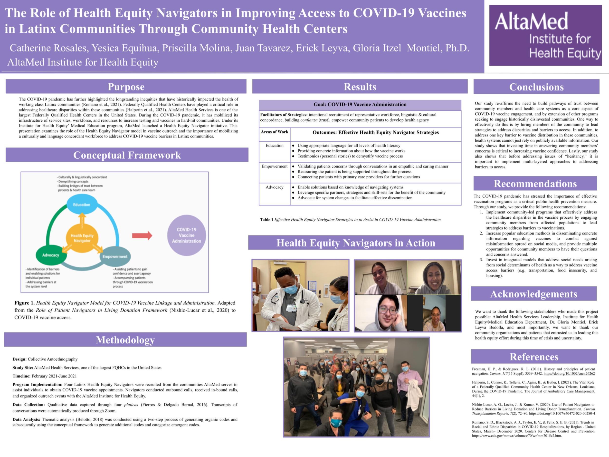 Description of Innovation: Starting in February 2021, AltaMed embarked on a demonstration project to test its Health Equity Navigator model’s effectiveness in improving access to COVID-19 vaccines in its service area. The program is part of the AltaMed Institute for Health Equity’s Undergraduate Medical Education department. It is designed to provide clinical experience to pre-med and other aspiring health professionals. Four Health Equity Navigator positions were pivoted to focus on COVID-19 vaccine engagement, to identify challenges related to underlying social determinants of health, and ultimately to help overcome these challenges. The innovation included three phases. Phase 1: Navigator-led inbound and outbound calls to identified panel of patients meeting initial vaccine eligibility of ages 65+.Phase 2: Inbound calls from patients and community members and outbound calls to non-AltaMed patients based on interests lists provided by community partners. Phase 3: Inbound calls and deployment of a partner community program to streamline appointments for non-patients. During these engagements, health navigators provide information, education, and support, as well as direct assistance to individuals in making appointments for their COVID-19 vaccine.